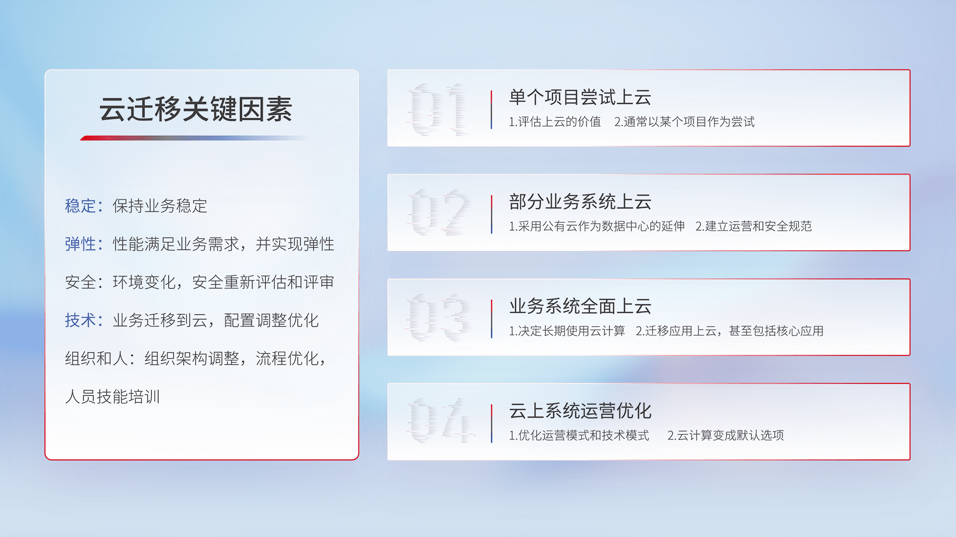 结合实际业务,,从规划设计、、云平台选型、、云原生改造、、、、数据迁移、、、、集成交付,,,迁移全过程为客户识别最佳上云路径,,做好风险识别管理,,,,设计网络架构、、、、身份权限、、、、安全审计合规、、、、操作审计、、、、日志审计、、监控告警策略、、多站点容灾设计等,,对云上基础设施进行整体规划,,,提升IT治理水平,,,,以满足弹性、、、、高可用、、、高性能的需求。。