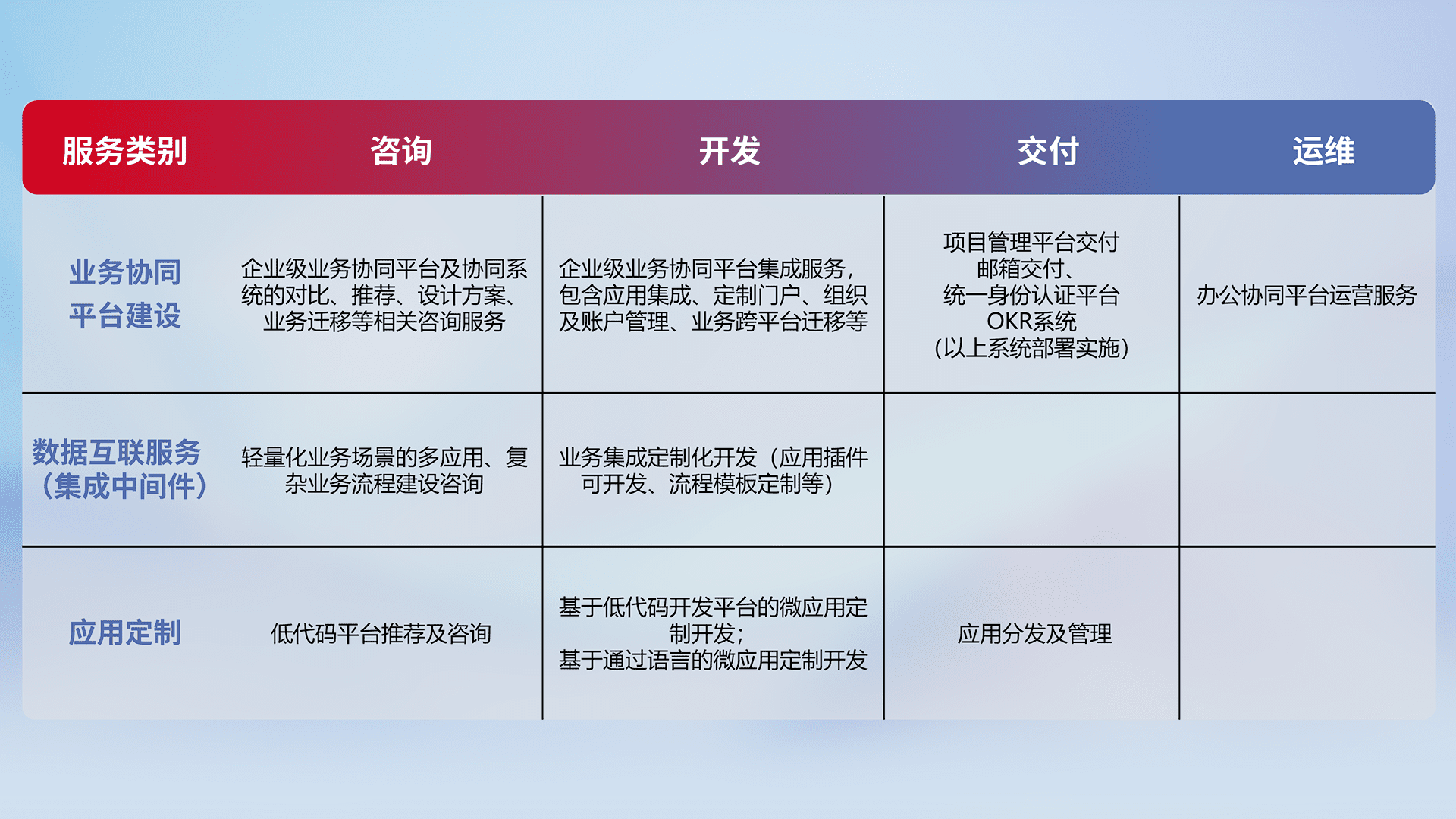 针对钉钉、、、企微、、、、IDaas等平台级产品提供产品的规划、、方案、、、交付、、、定制化开发等服务,,实现如统一协同办公、、、、智能客户服务、、、混合会议管理、、、、智能数据查询、、等业务场景,,,,实现数字化转型。。。